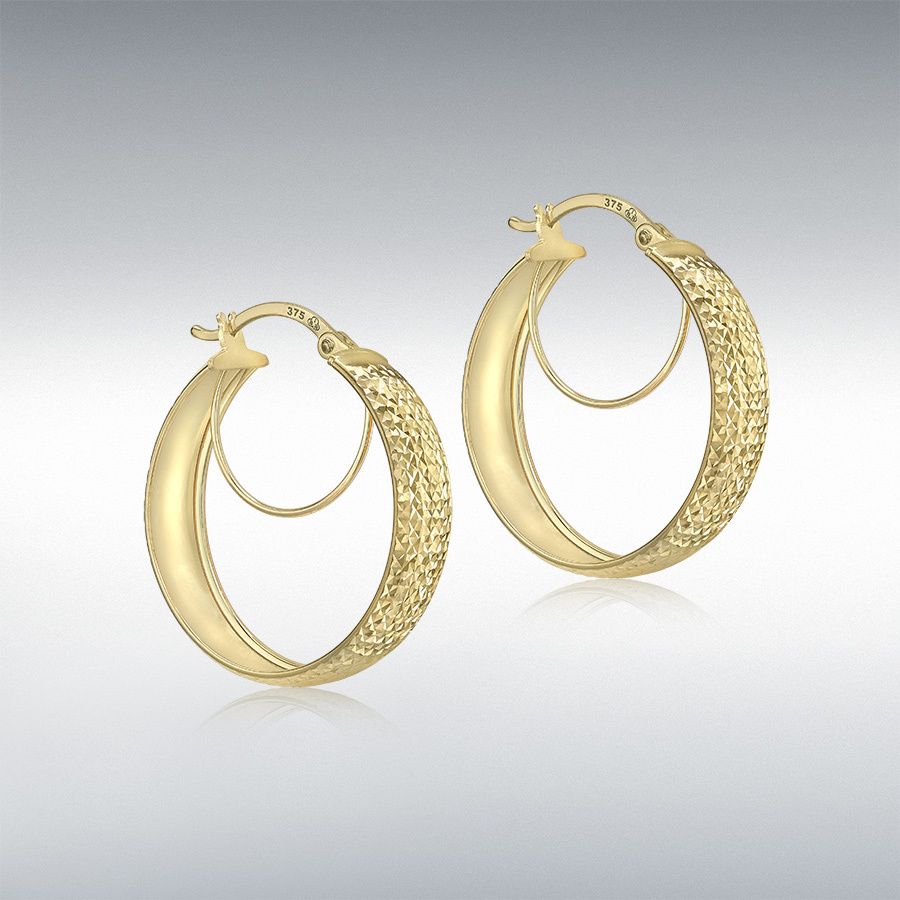 9ct Yellow Gold Diamond Cut 24mm Double Hoop Creole Earrings. Details: Earring Band Width 6mm, Small Inner Hoop Width 0.6mm. Diameter: 24mm. Finish: Diamond Cut. Fitting: Hinged Post. Style: Creole.