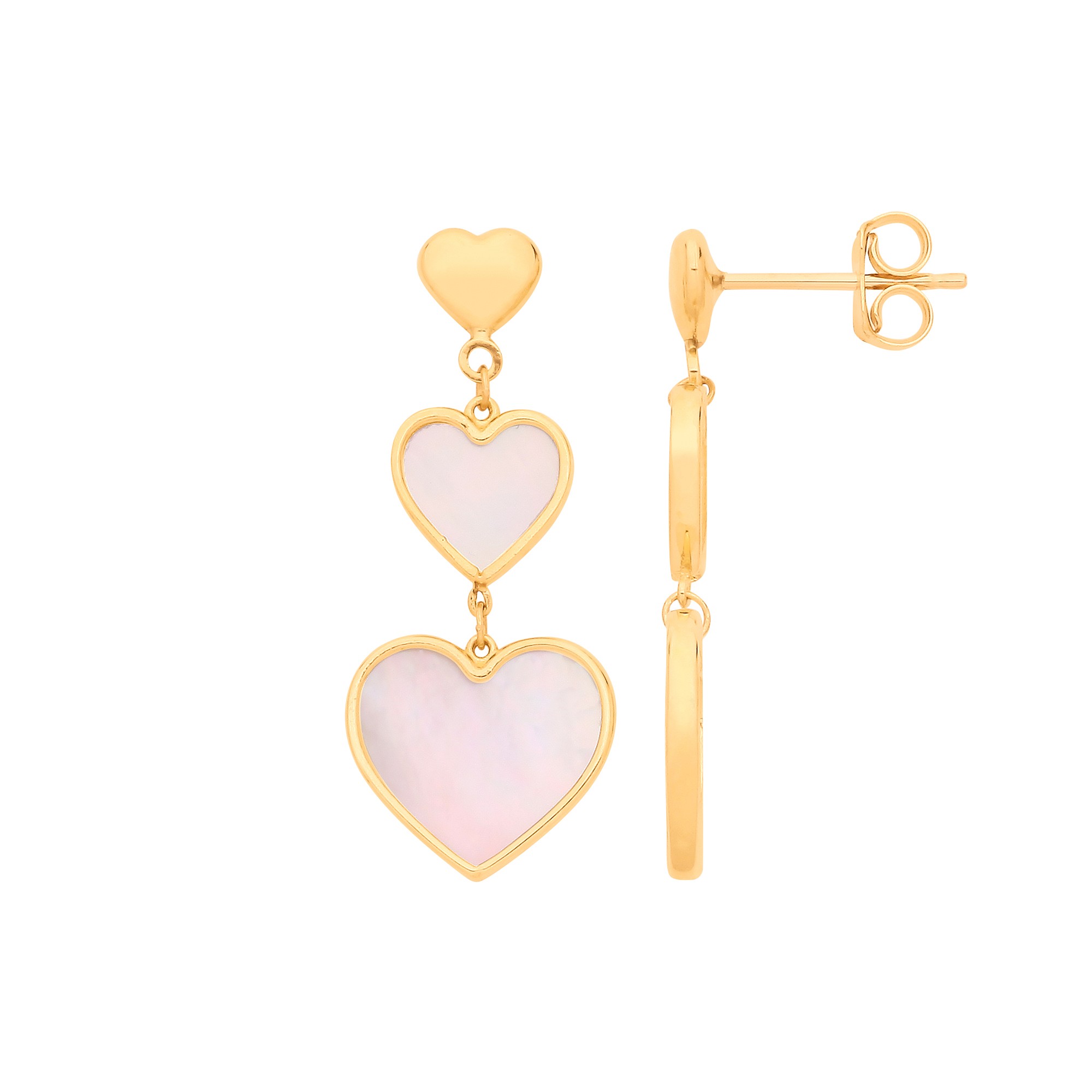 9ct Yellow Gold Mother of Pearl Hearts Drop Earrings