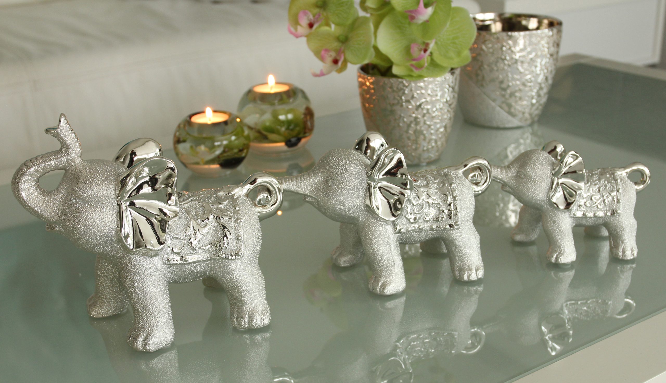 Gilde Grace – Set of 3 Ceramic Elephants. Width:50.00 cm. Height:17.00 cm. Depth:10.00 cm. One vase only