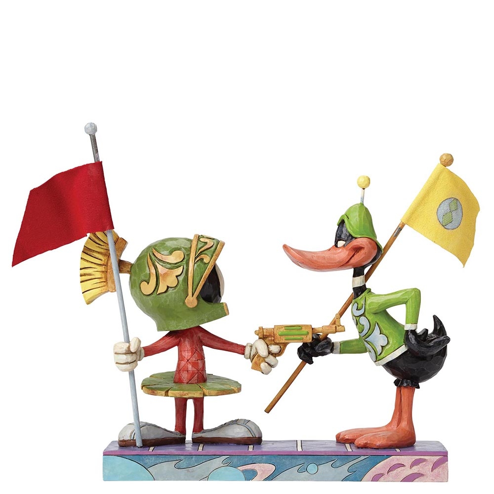 Jim Shore adds his unique artistic touch as Daffy Duck confronts Marvin the Martian and his space modulating ray gun in this harrowing scene from the classic Looney Tunes cartoon. Never fear, Daffy wins out and the world is saved. For now… Unique variations should be expected as product is hand painted. Item is packed in a branded craft box. Not a toy or children’s product. Intended for adults only. Height:17.0cm. Width: 19.0cm. Depth: 7.0cm