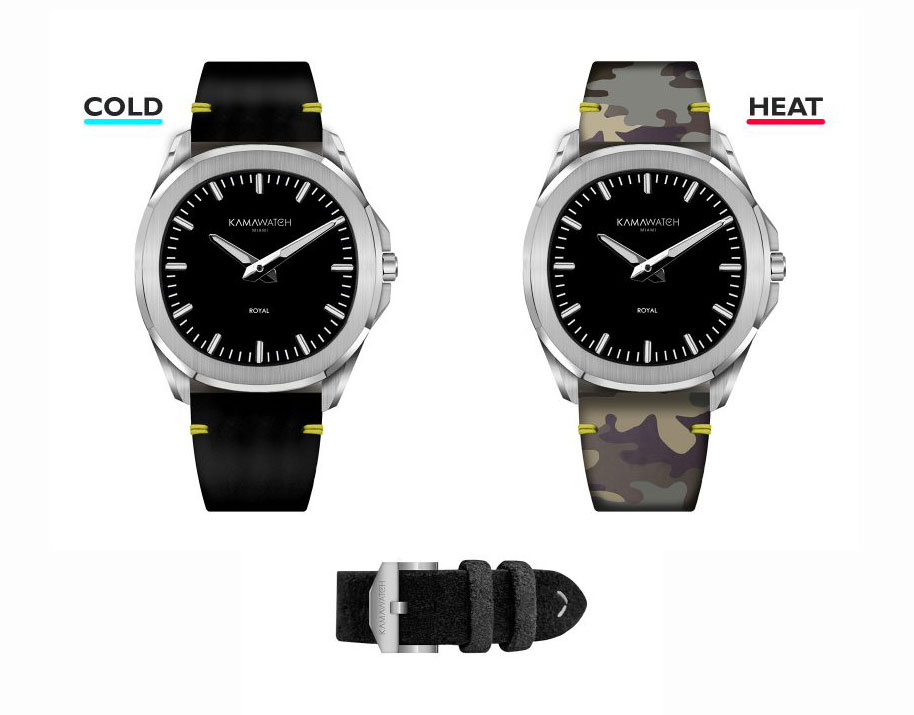 The watch from Kamawatch features two looks in one. The soft leather strap changes from black to green camouflage at 31c
