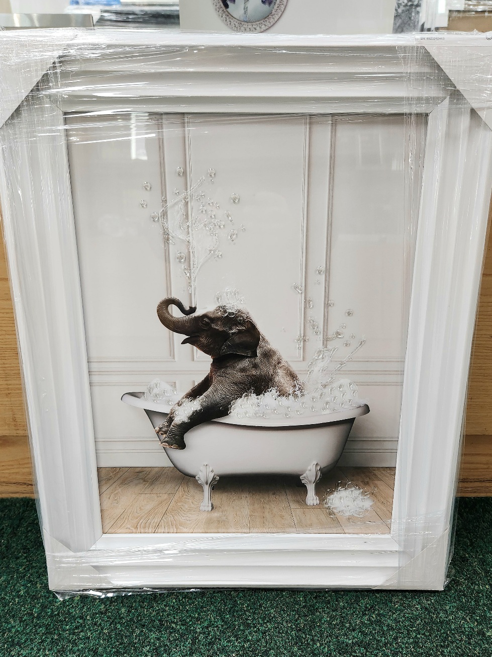 Liquid Art – Elephant Splashing In The Tub in a White Lyon Frame