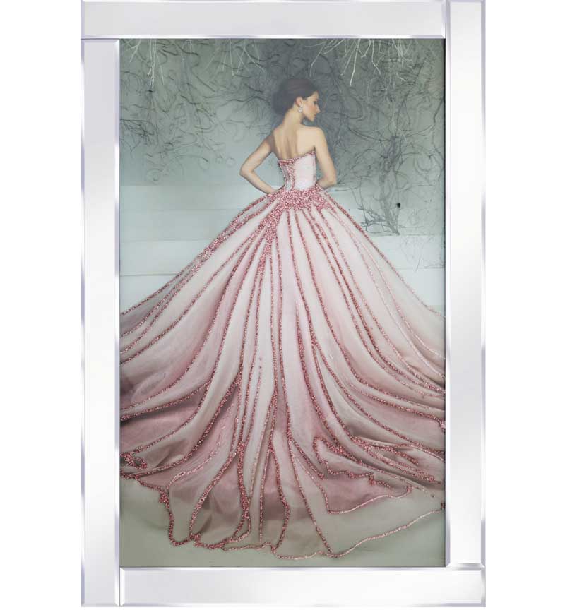 Lady in Pink Dress Mirror Framed Picture. 600mm x 1000mm. Hand Finished in the UK. The mirrored frames make these pictures heavy so we recommend using suitable heavy duty wall fixings. Please do not use wire or string to hang them.