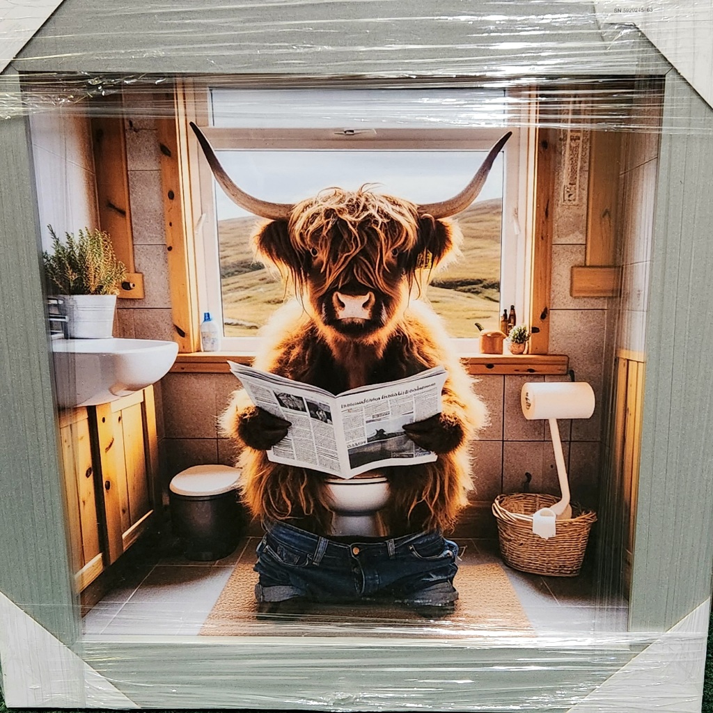 Liquid Art – Male Highland Cow on Toilet Reading in Black Alpha Frame