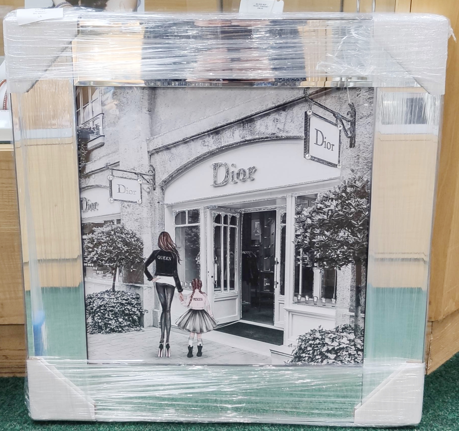 Liquid Art – Black & White Mother & Child in Front of Dior Store Front on Mirrored Frame