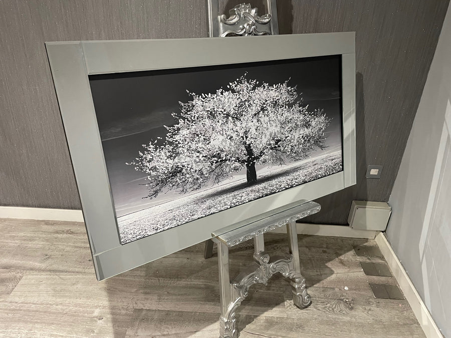 Liquid Art – White Cherry Blossom Tree in a Silver Mirror Frame