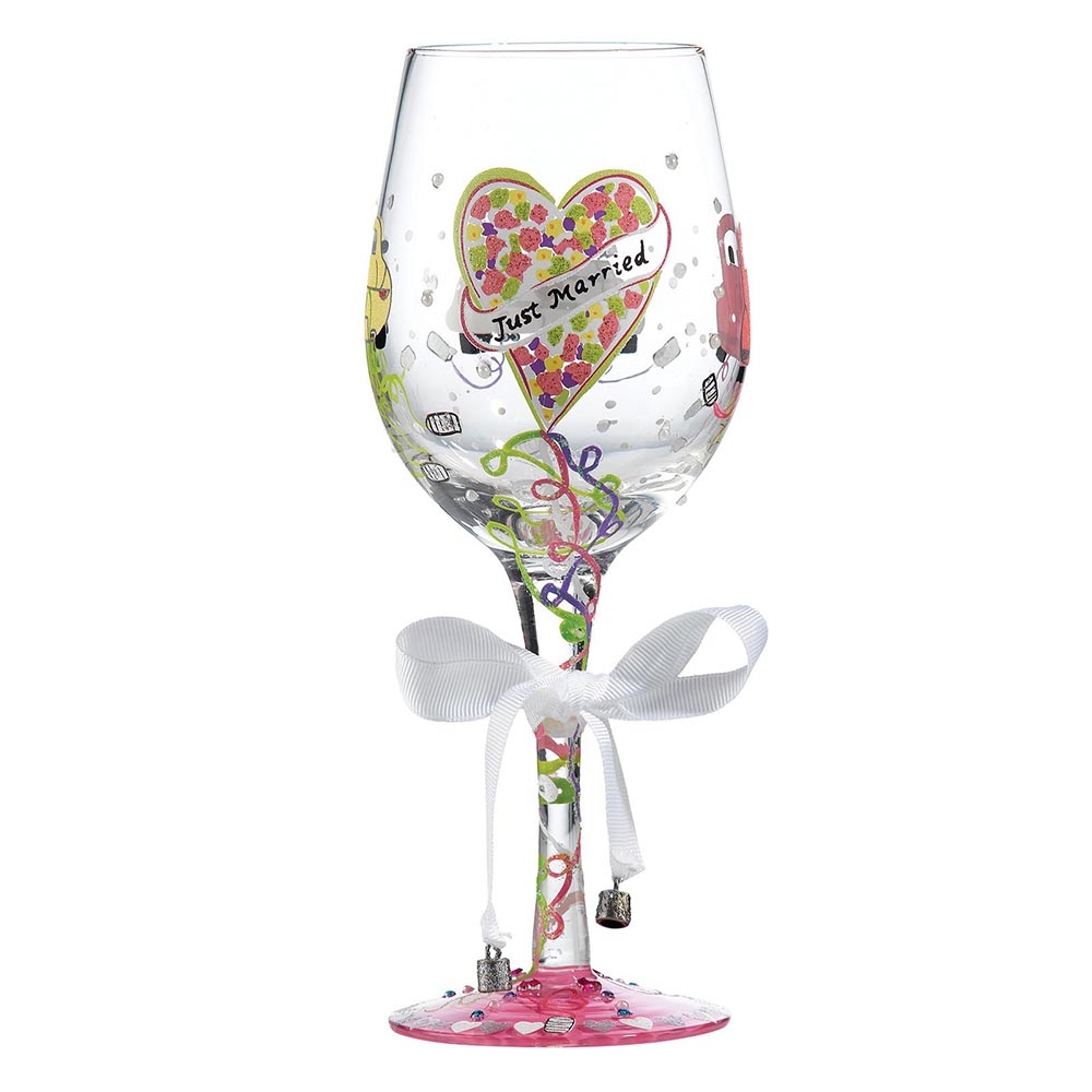Part of our Lolita Wedding Collection range, this glass is a beauty. Decorated with his and her wedding cars, and the tin cans following on, this is lovely humorous design that’s a unique engagement, hen night or wedding gift for the lucky girl who also enjoys a giggle. Designed by the US artist Lolita, each glass is hand blown and painted using food grade non-toxic paint to create their stunning designs. Each Lolita wine glass comes packaged in a branded gift box with an individual wine cocktail recipe on both the bottom of the glass and box. Recommended hand wash only – not suitable for the dishwasher. Please note that unique variations should be expected as the product is hand decorated. Height:22.5cm. Width: 8.5cm. Depth: 8.5cm