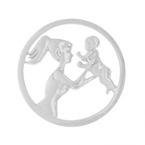 This rhodium plated silver (925) mother & child cover insignia fits the 33mm medallion. You can combine this spherical insignia with other insignias.