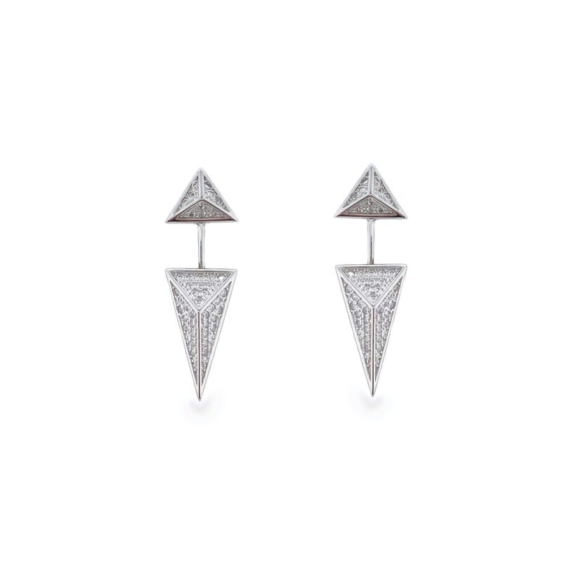 Sleek dart design earrings, cleverly designed to either be worn as a simple stud earring on its own or with the included stylish earring jacket giving a front and back look. Features set pave solitaire Zirconia Crystals in a round brilliant cut (Triple A rated simulated diamonds, facet cut for pure clarity and sparkle). Set in Rhodium Plated Vermeil on Sterling 925 Silver in a high shine finish. (Rhodium is part of the Platinum family of metals for a more durable scratch resistant finish). Featuring a traditional earring post. Each item comes beautifully packaged in our luxury designed boxes including protective pouch to keep your jewellery item looking its best.