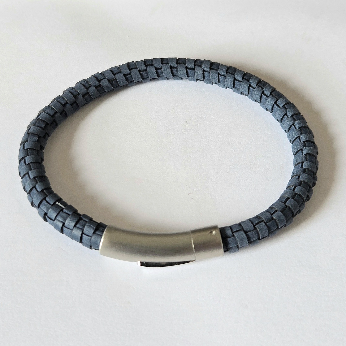 Blue Leather Bracelet with Matte & Polished Steel Clasp – 21cm