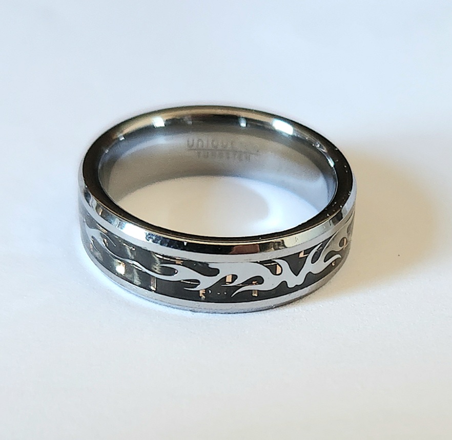 UNIQUE & CO Tungsten Carbide Ring. Yellow IP with a Black Carbon Fibre inlay. State size required when ordering